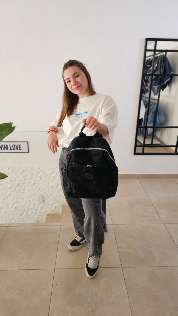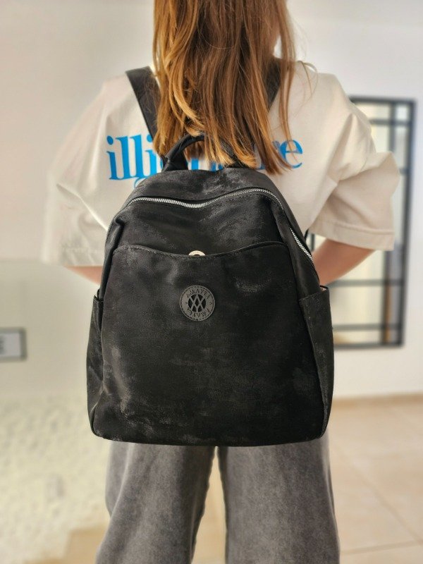 Material: Ecocuero jaspeado. Bolsillos laterales, tira regulable, bolsillo interno. Medidas:32x28x13cm