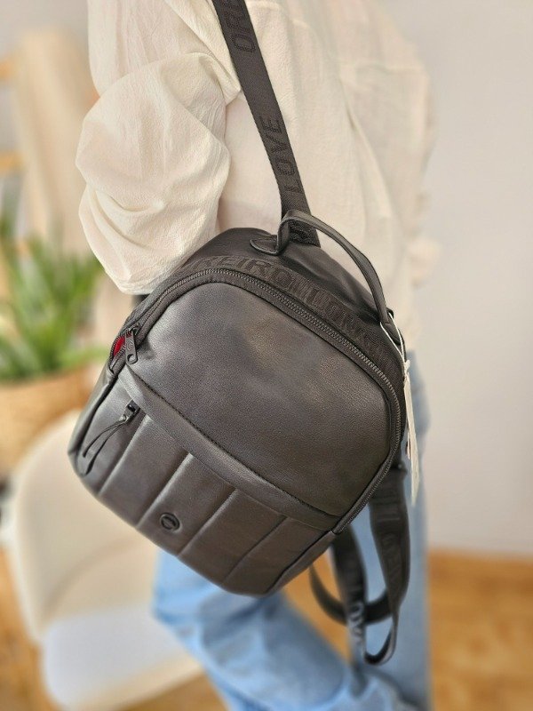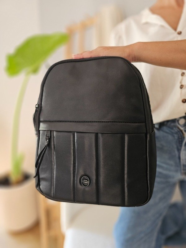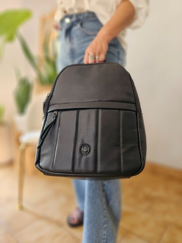 Material: Ecocuero. Bolsillo frontal, tiras regulables, organizador interno, incluye packaging. Medidas:35x26x12cm 14" pulgadas